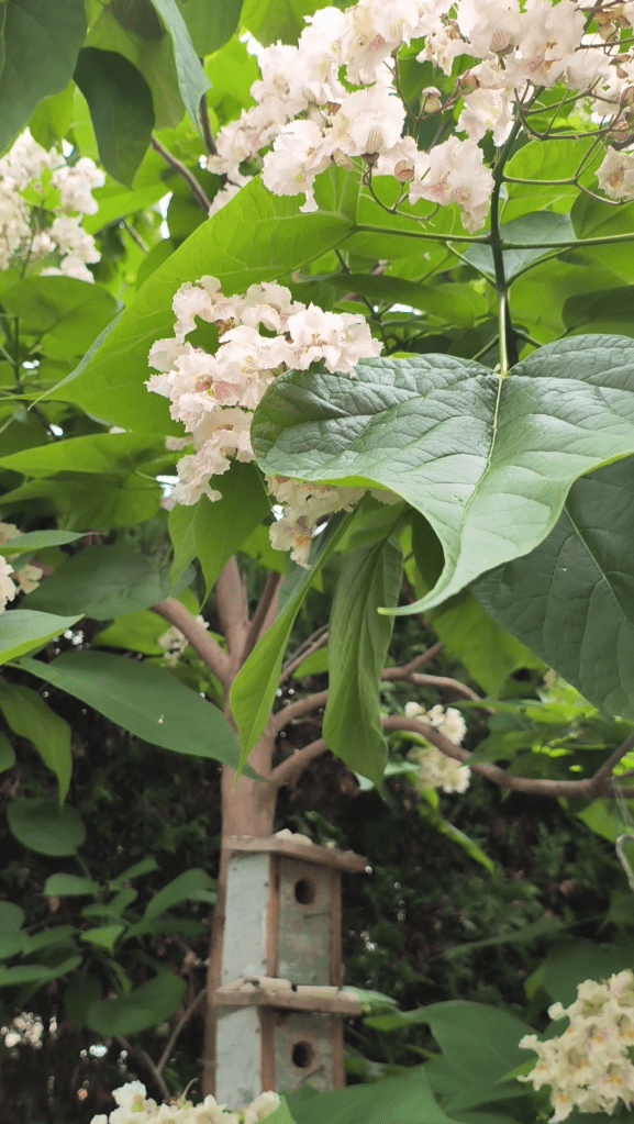 Je me suis levée. Par la fenêtre, j’ai vu mon catalpa. Je l’ai planté dans ma cour, il y a trois ans et cette année, il est magnifique ! Il est maintenant garni de nombreuses fleurs au parfum suave qui embaument l’air, surtout le soir tombé.